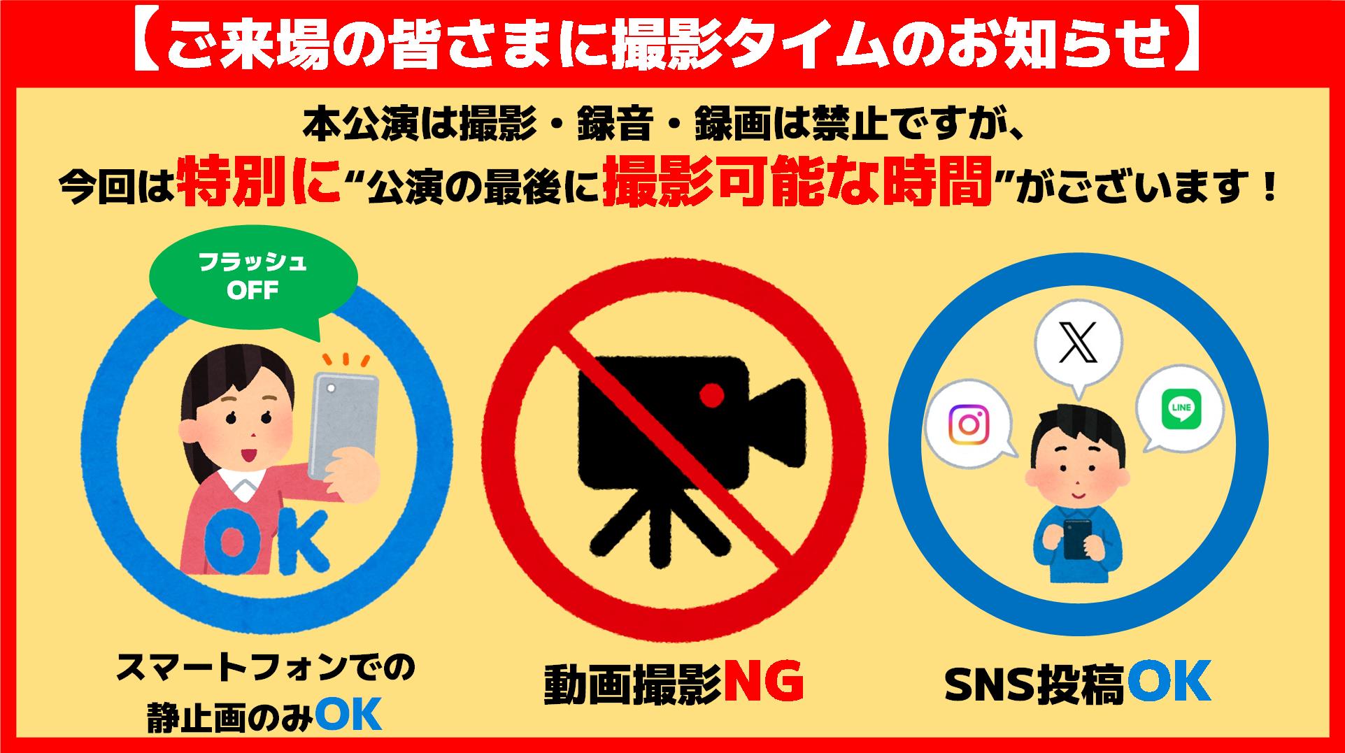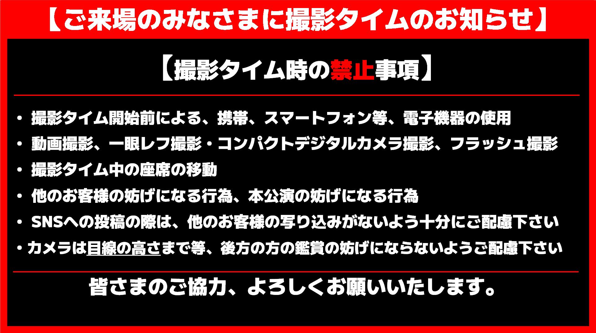 ·表演公演中、舞臺衹謝中嚴禁攝影、錄音。如果發現的話,請在劇場內刪除數據。