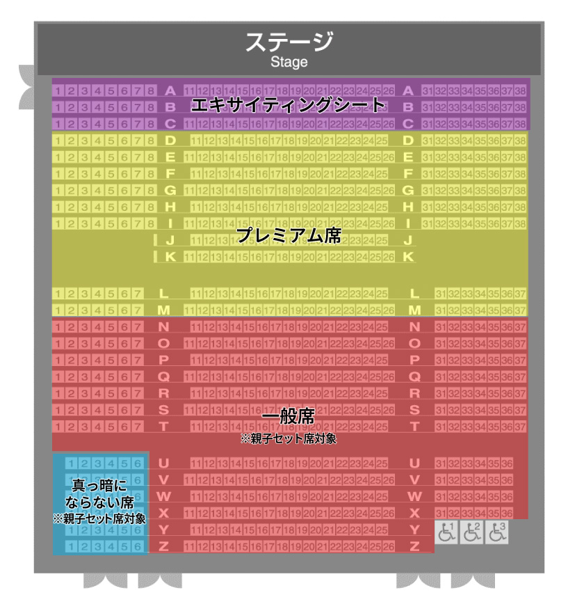 即使在表演期間,這些座椅也能保持亮度。如果您是第一次帶孩子或擔心黑暗,請使用此選項。座位位於 U 至 Z 排、1 至 6 號(請參閱此處的座位圖)。